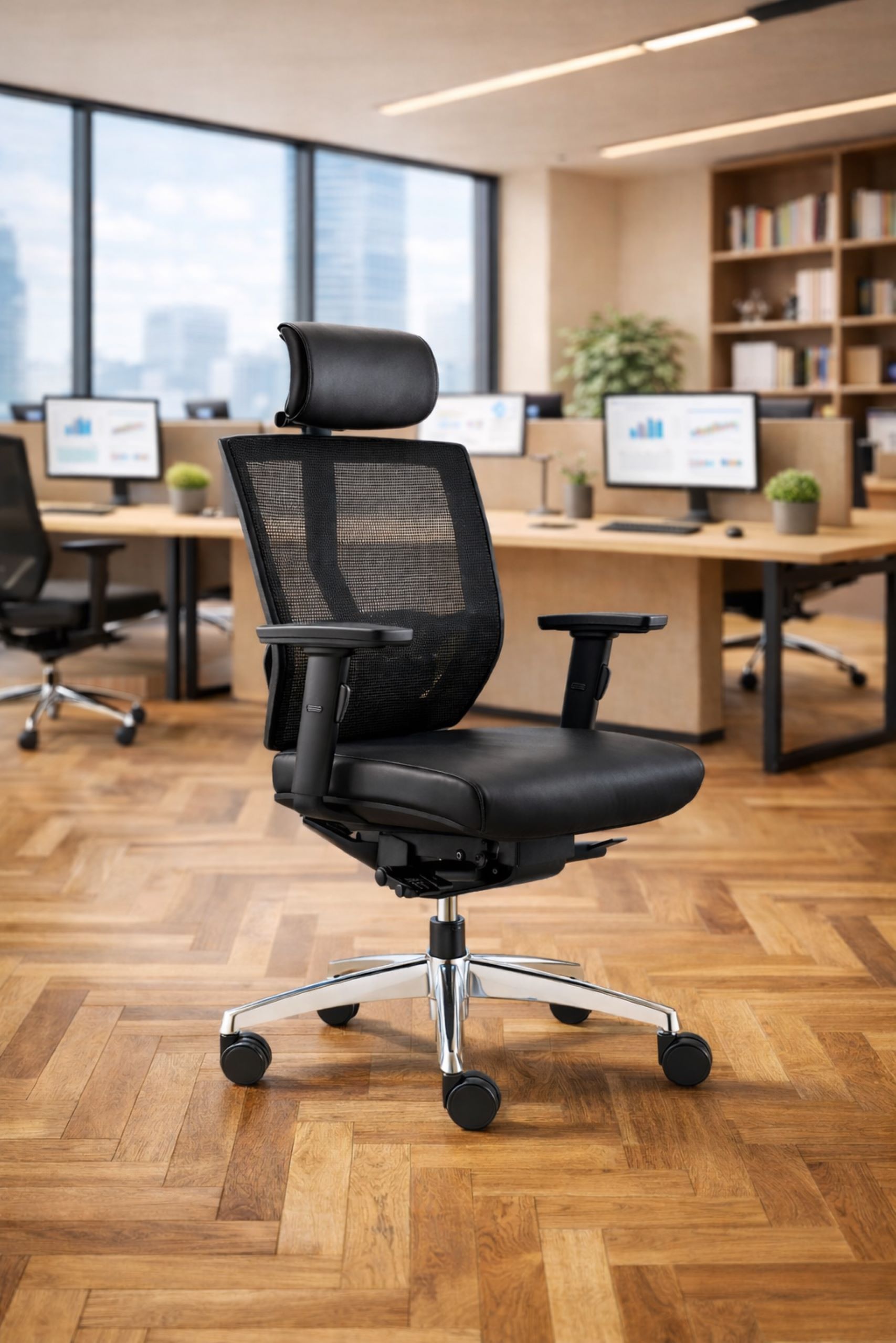 – Een verstelbare lederen hoofdsteun biedt extra ondersteuning aan met name de nek maar ook uw hoofd, essentieel voor een lange werkdag.