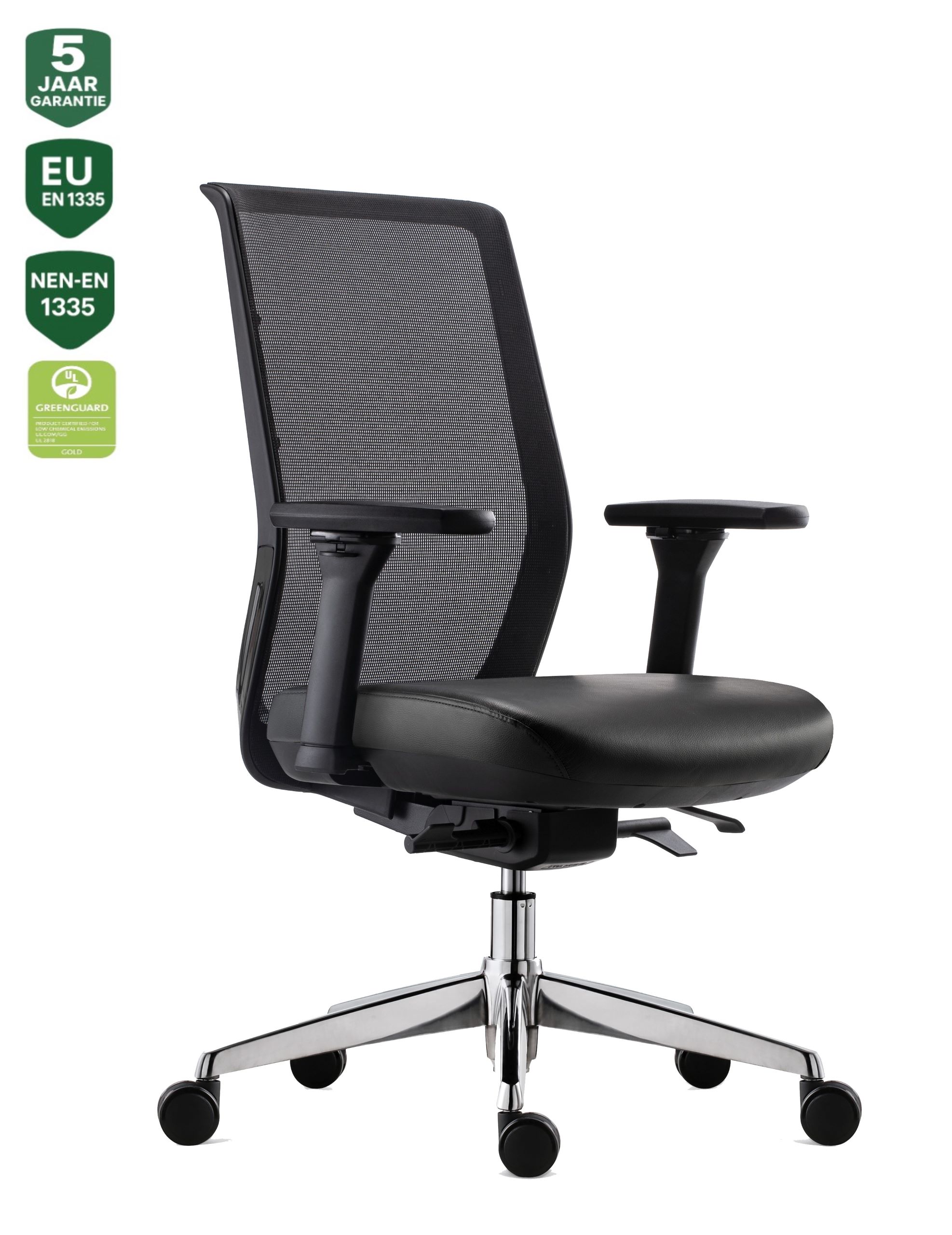 – De combinatie van een mesh rugleuning, zwarte lederen zitting én lederen hoofdsteun geven een luxe, moderne en professionele uitstraling aan elke werkruimte.