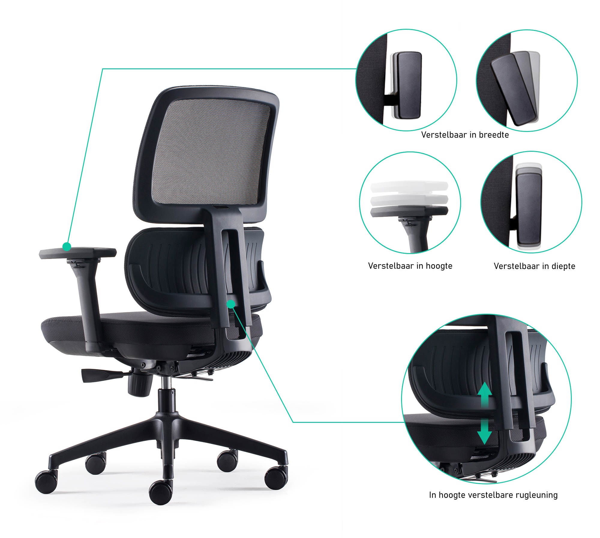 – De armleggers zijn in hoogte verstelbaar, naar voren en achteren en schuin naar binnen en buiten zodat uw armen altijd de perfecte ondersteuning krijgen, ongeacht uw werkhouding.