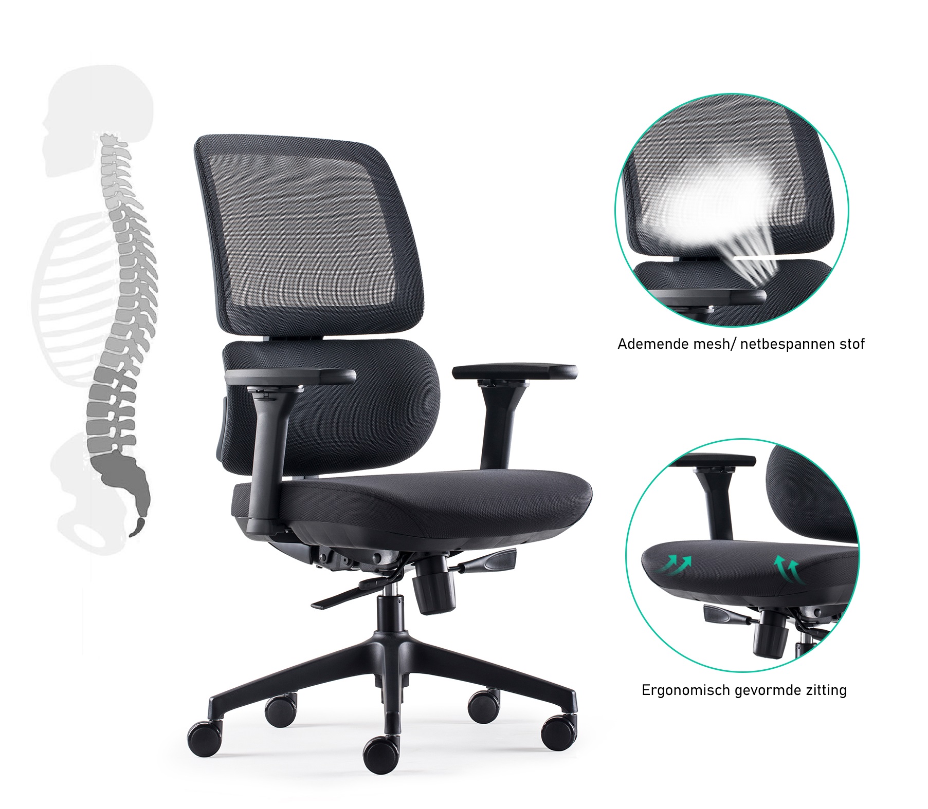 – De dubbele rugleuning, deels diepgrijs gestoffeerd, deels bekleed met eveneens diepgrijze mesh-netbespanning, biedt ademend comfort waardoor u koel en comfortabel blijft, zelfs tijdens lange werkdagen.