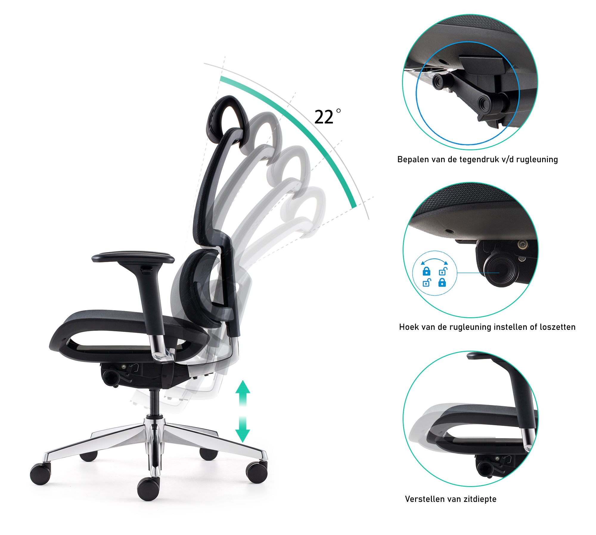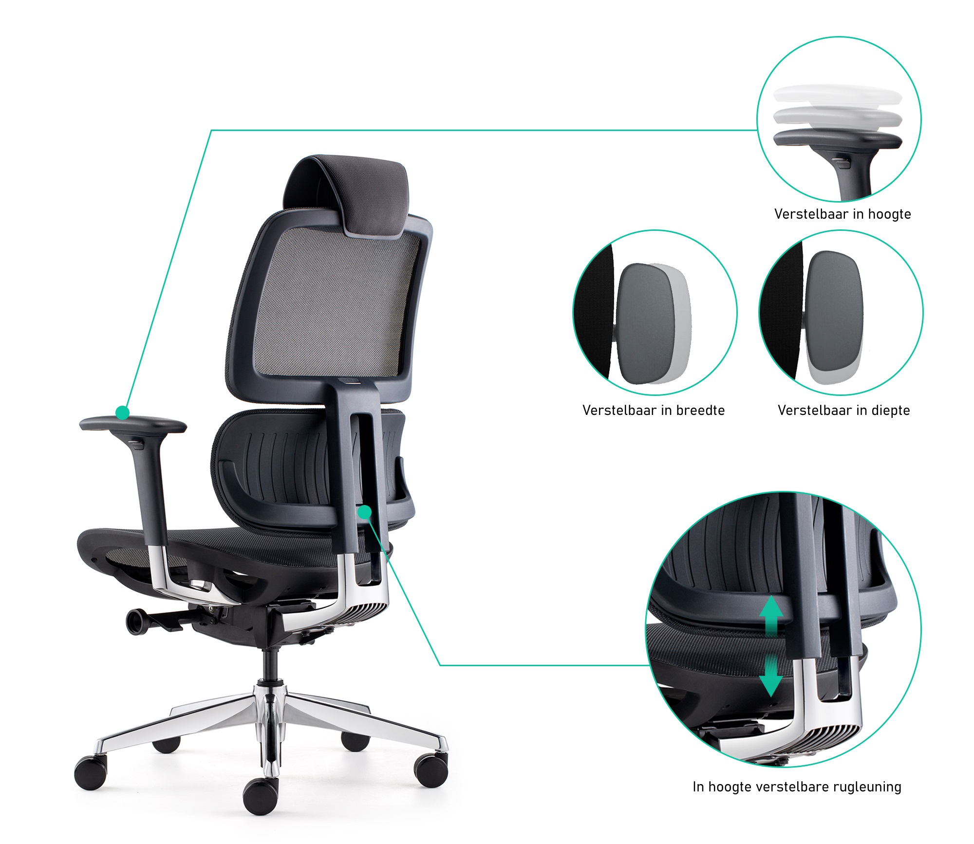 – The armrests are height adjustable, can move forward and backward, and tilt inwards and outwards to give your arms the perfect support, regardless of your working position.